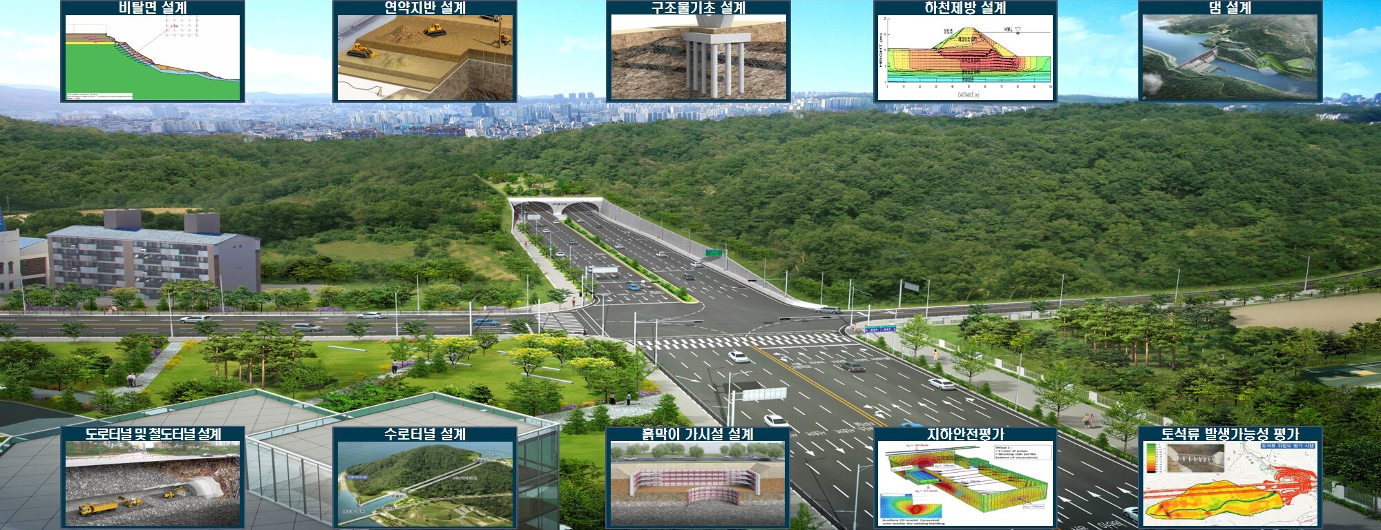 국내·외 수많은 실적과 함께 신기술·전문소프트웨어를 적극 활용하여 하천 제방 및 댐, 도로·철도 터널 및 수로터널, 비탈면 및 연약지반, 산사태 및 토석류, 교량기초 및 해상풍력기초, 가시설 및 지하안전평가 등의 터널 및 지반분야와 관련된 설계를 제공하고 있습니다.