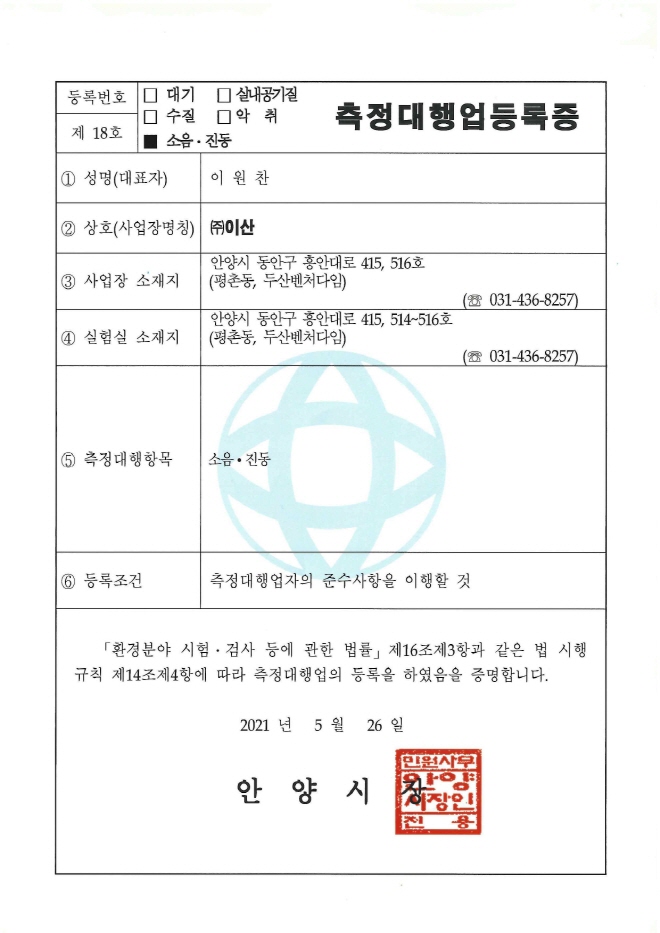 소음∙진동 측정대행업 - 2021.5.26 안양시청 |